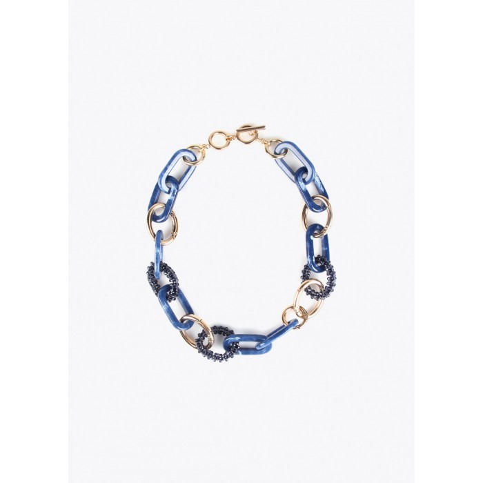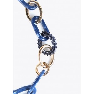 Collar compuesto por argollas acrílicas de color azul, combinadas con argollas doradas y otras con piedras de cristal facetado en el mismo tono. Un collar moderno e ideal para combinar con nuestra colección textil. Medidas: 55cm+3cm cadena extensión